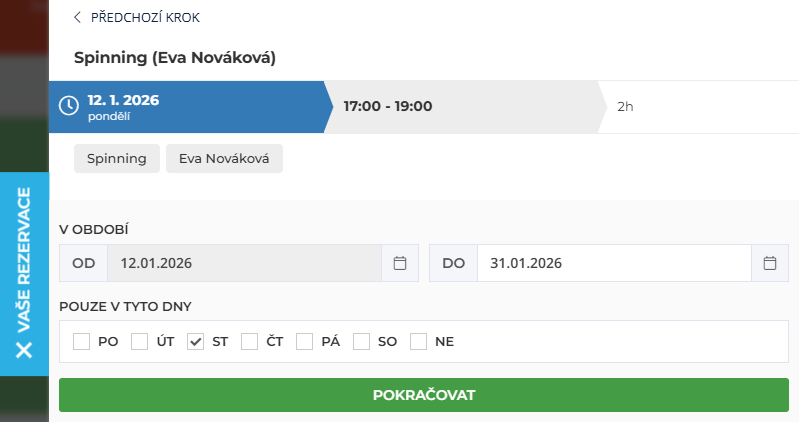Vytvoření více opakujících se rezervací vyžaduje definici období. Všechny vytvořené termíny budou rezervovány v rámci zadaného časového období. Pokud je tedy termín nastaven na opakování po několik vybraných dnů v týdnu, ale zákazník si přeje rezervovat termíny pravidelně pouze v jeden vybraný den, je také možné vybrat konkrétní dny, které budou v daném období rezervovány.