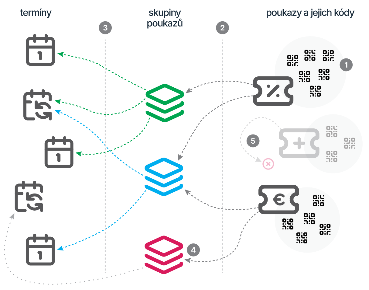 Každý uplatnitelný poukaz musí být součástí alespoň jedné skupiny poukazů [5 v obrázku], takže je vždy nutné vytvořit skupinu, do které se vytvořené poukazy přiřazují [2 v obrázku]. V nastavení konkrétního termínu se následně definuje, jaká skupina poukazů je pro daný termín použitelná [3 v obrázku]. U termínu se tedy nenastavují konkrétní poukazy, ale jedna skupina těchto poukazů. To přináší lepší přehlednost a snadnější správu poukazů na jednom místě. Zároveň jeden poukaz může být přiřazen do více skupin a tím být dostupný u různých termínů (termín může mít přiřazenu pouze jednu skupinu).