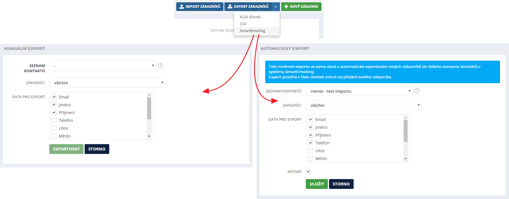 Tento export umožňuje jednorázově přenést aktuální kontakty Vašich zákazníků do zvoleného seznamu kontaktů systému SmartEmailing. Můžete si také určit, jaká skupina kontaktů a jaké údaje se mají exportovat. Pokud zákazník již v seznamu kontaktů existuje (podle e-mailové adresy), tak se jeho údaje pouze aktualizují. Zákazníci, kteří nemají zaškrtnuto „Zasílání novinek“, jsou exportování také, ale jejich e-mail je automaticky nastaven jako „Odhlášený“.