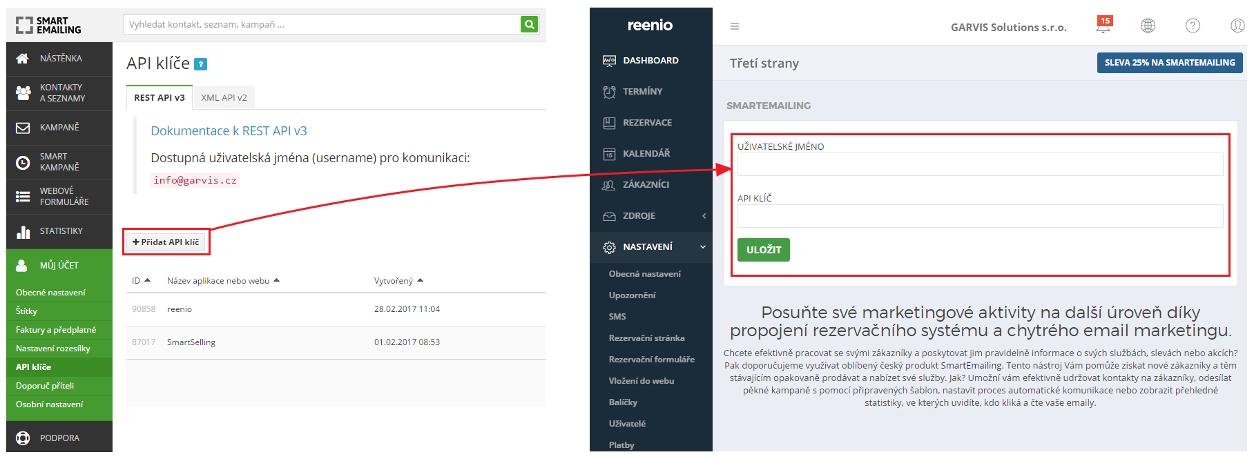 Pokud již máte vytvořený SmartEmailing účet a přístup do administrace, je potřeba získat údaje pro propojení se systémem reenio. Tyto údaje najdete v hlavní nabídce Můj účet - API klíče. Po kliknutí na Přidat API klíč a zadání jména aplikace k propojení (např. reenio) se zobrazí speciální řetězec znaků. Ten společně se svým přihlašovacím jménem (zobrazeno na stránce se seznamem API klíčů v administraci SmartEmailing) překopírujete do nastavení v rezervačním systému reenio.