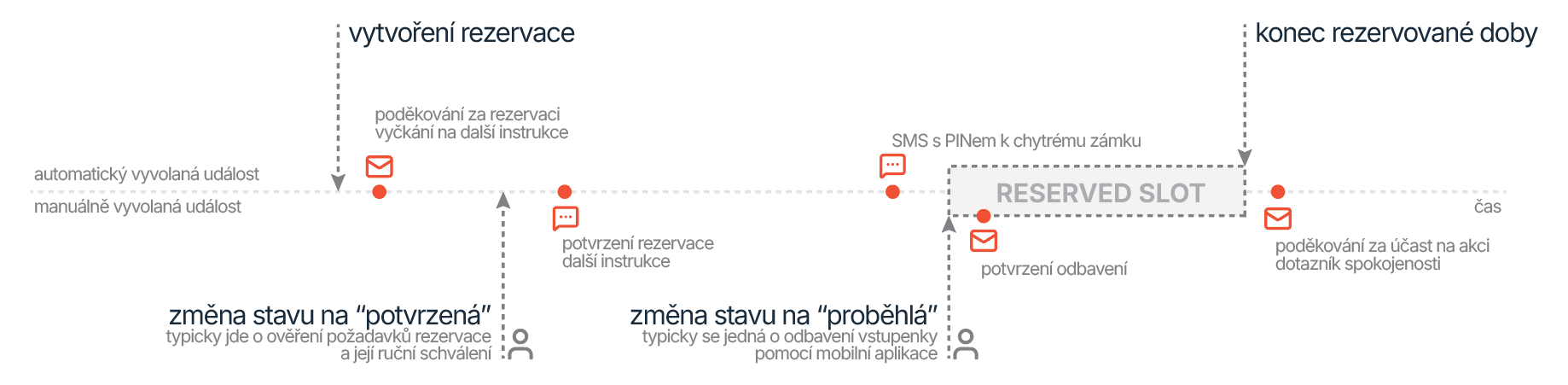 Rozesílání vlastních zpráv může být nastaveno v závislosti na události, která je přímo spojená s rezervací a příslušným okamžikem v čase. Události mohou být buď automatické, nebo naopak závislé na změně stavu rezervace, která musí být provedena manuálně v administraci, případně prostřednictvím mobilní aplikace přímo na místě. Automatické události nepotřebují žádný krok ze strany administrace. Konkrétně se jedná o události jako je vytvoření rezervace a následně konec rezervovaného termínu, který se automaticky vyhodnotí na základě času rezervace. Změna stavu konkrétní rezervace má pouze informační charakter (potvrzená, proběhlá, apod.), a proto není možné spoléhat na změny těchto stavu, které rezervační systém automaticky neprovádí. Konec rezervovaného termínu tedy není totéž jako změna stavu rezervace na proběhlá, která může být provedena manuálně dříve či později. Pokud tedy v administraci nezměníte stav rezervace, příslušná vlastní zpráva nebude odeslána.