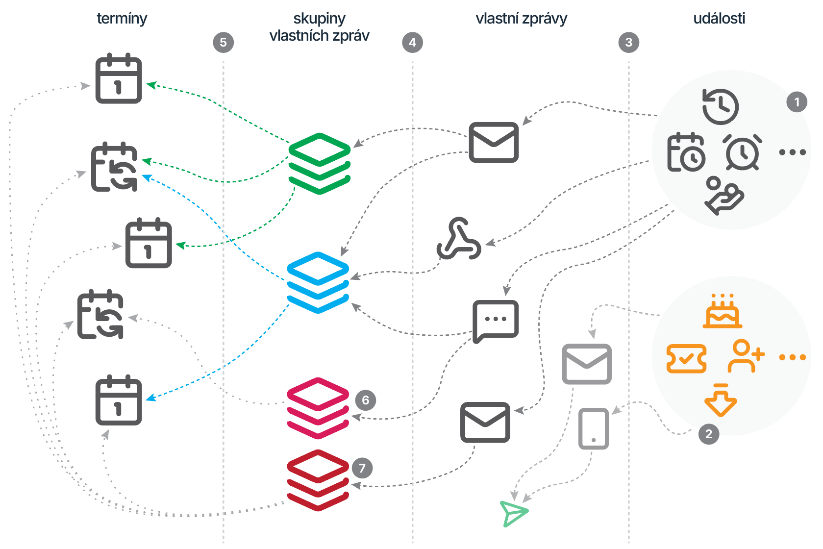 Vlastní zprávy jsou vždy spojeny s nějakou konkrétní událostí tzv. spouštěčem [3 v obrázku]. Tyto údálosti pokrývají situace s vazbou na rezervace či termíny [1 v obrázku], ale také mohou být bez této vazby a spouštěčem je typicky nějaká událost v čase [2 v obrázku], např. narozeniny zákazníka, registrace zákazníka. V případě této druhé skupiny vlastních zpráv pak není potřeba zařazování do skupin či vazba na termíny, ale zprávy jsou odesílány autonomně dle typu události.