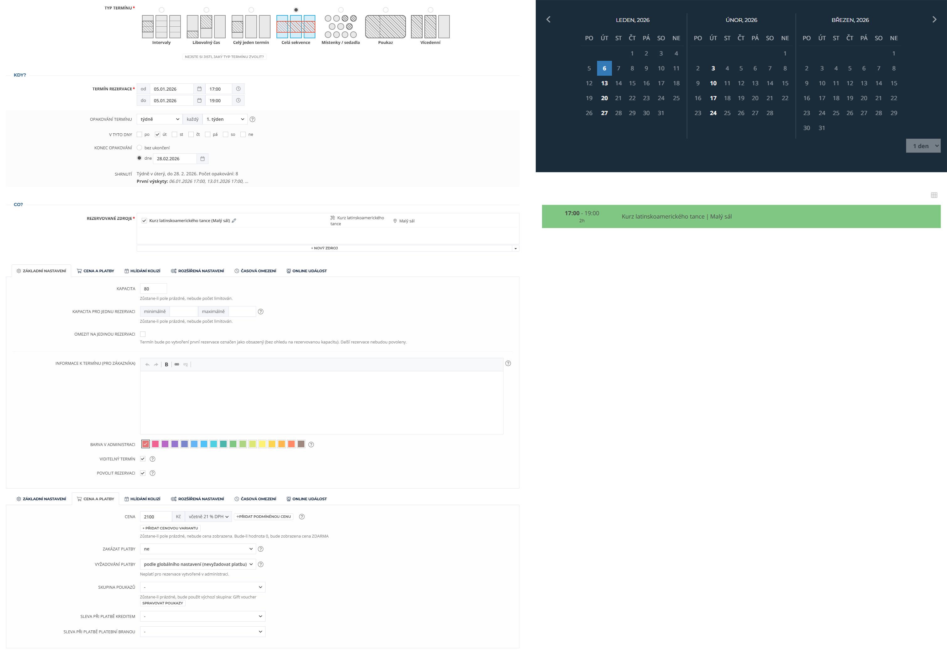 Pokud je potřeba, aby jednotlivé dny v rámci sekvence měly rozdílný čas, např. kurz probíhá vždy v pondělí v 17:00 a ve středu v 19:00, je nutné nejprve vytvořit celou sekvenci pomocí opakování, a to pro všechny dny (pondelí i středa od 17:00). Následně je možné středeční termín upravit (jednotlivě a postupně jako editace jednoho výskytu) a přesunout na odpovídající čas, tj. 19:00. Tato úprava zachová celou sekvenci pro vytváření rezervací, ale už nebude možné jednotně editovat termíny v rámci nastaveného opakování.