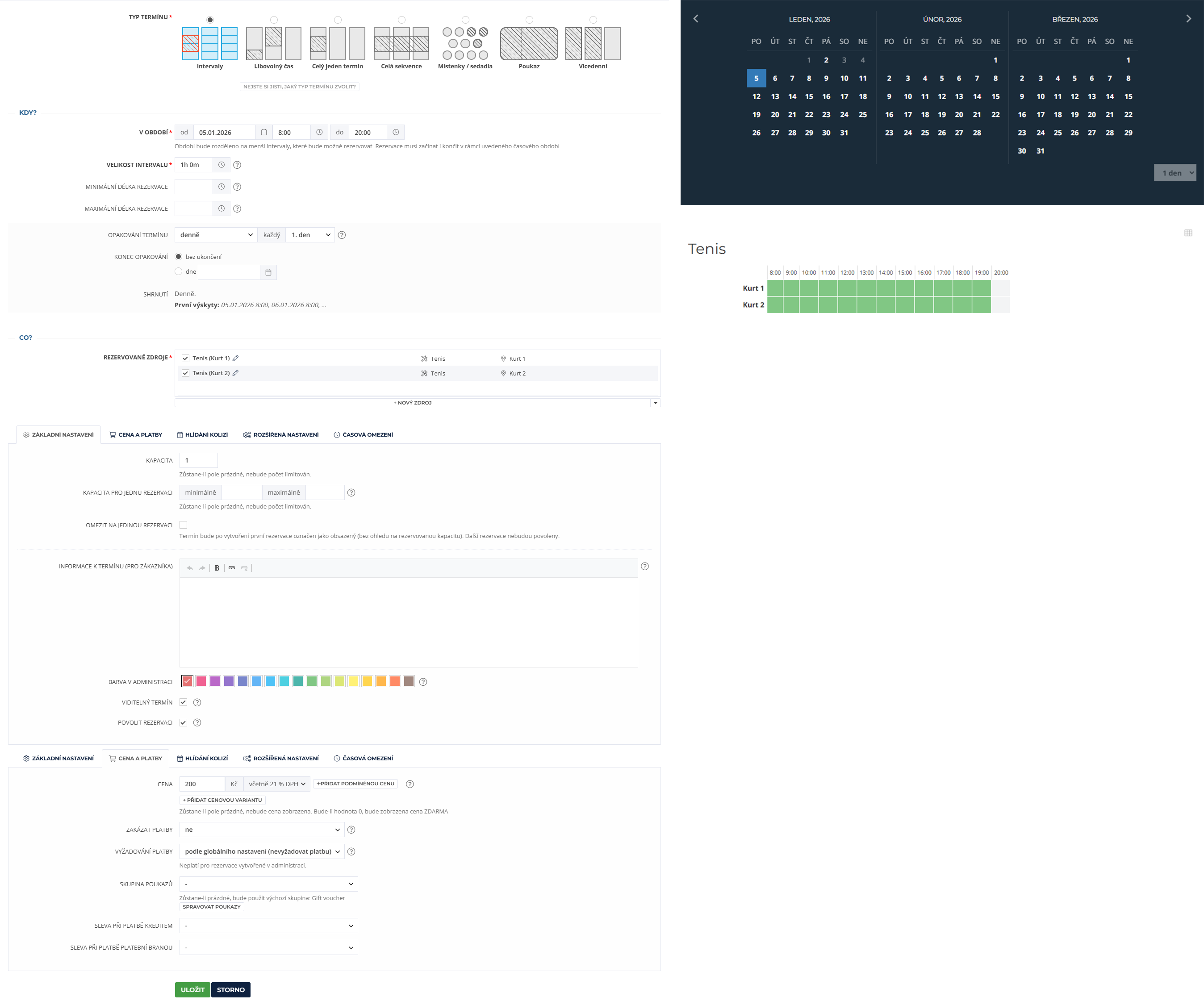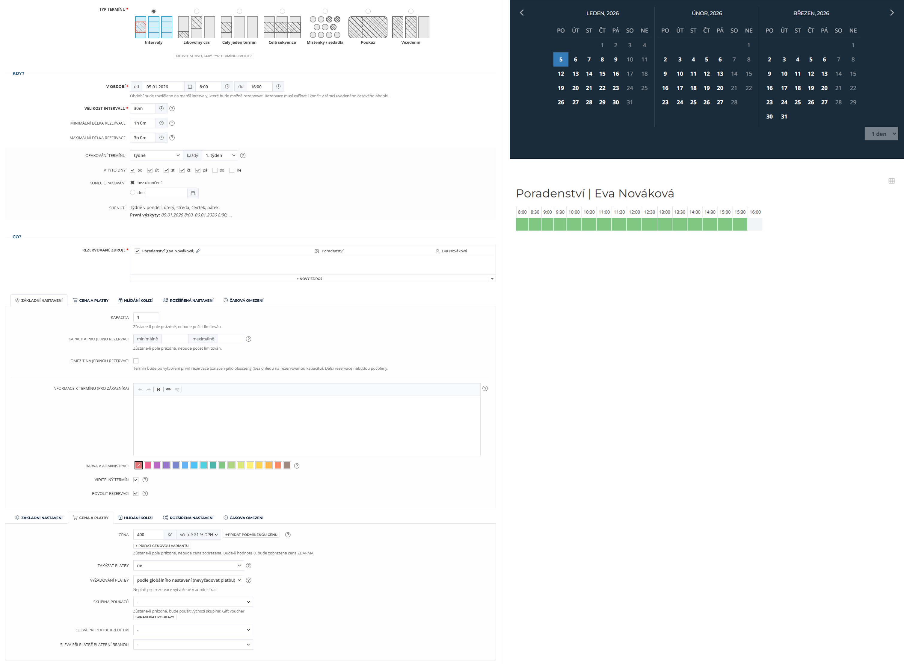 Intervalový termín umožňuje definovat časové okno v rámci jednoho dne, které já následně rozděleno na menší časové úseky (intervaly). Zákazník si následně může rezervovat jeden či více po sobě jdoucích intervalů (v závislosti na konkrétním nastavení termínu).