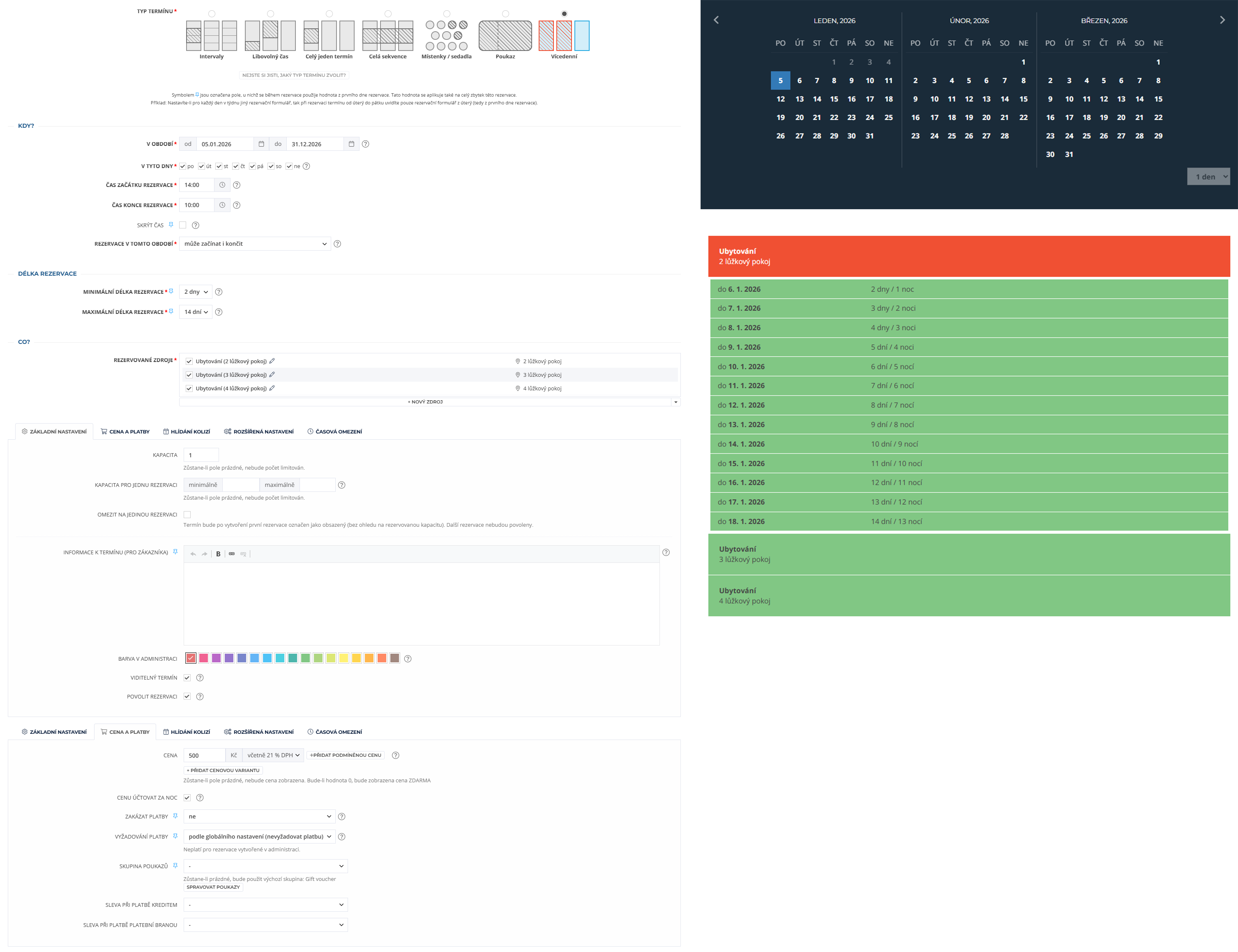 Vícedenní termín umožňuje rezervovat jeden či více po sobě jdoucích dní. Díky nastavení vícedenních termínů s různými parametry na různé dny (v rámci nastavení opakování) můžete specifikovat např. různé ceny pro využití daných služeb. Systém automaticky umí spojovat nabídku termínů, které na sebe navazují a využívají stejné zdroje.